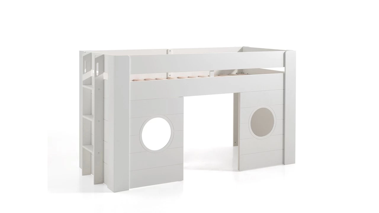 Geef de kinderkamer een compleet nieuwe look met deze unieke Halfhoogslaper Freya. Door het gebruik van witte MDF platen met een soort planken patroon en 2 grote patrijspoorten als open ramen maakt je kind in een handomdraai van het bed een waar schip. Nou nog alle goederen veilig opbergen en dan kan de woeste zee bevaren worden.
