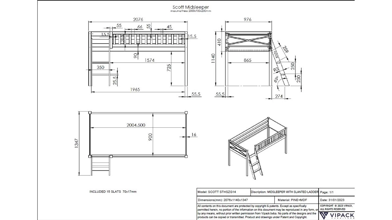 Met Halfhoogslaper Scott met bureau en commode wil je kind niets liever dan tijd spenderen in de slaapkamer. Vanaf de halfhoogslaper kan je kind alles zien en meemaken. Een onverwinnelijk gevoel tijdens het spelen en een gerust en veilig gevoel tijdens het slapen. De halfhoogslaper wordt geleverd met Bureau voor halfhoogslaper Pino/Scott en Commode 4 laden Pino/Scott.