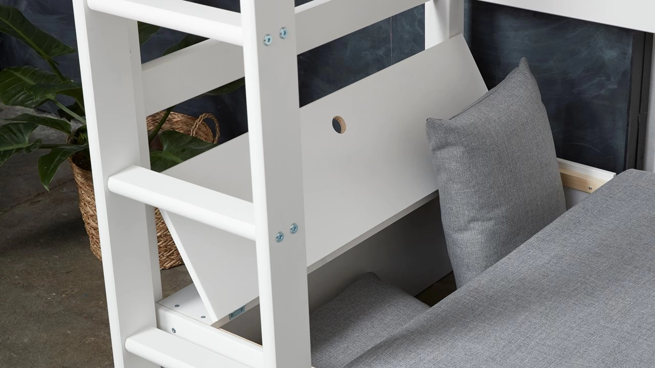 Met deze Hoogslaper Jip met bedbank en bureau kies je voor meer dan alleen een kinderbed. Een hoogslaper creëert een extra ruimte onder het bed die je op allerlei manieren kunt gebruiken. Zo is bij deze hoogslaper een klein bureau gemaakt met een tweetal legplanken zodat je kind er eenvoudig kan knutselen, spelen of huiswerk kan maken. En daarnaast is er een fijne bedbank ingebouwd waar je kind lekker kan chillen of een logeerplek van kan maken voor een vriendje of vriendinnetje.